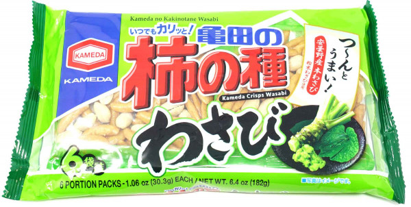 Der Snackmix ist eine Mischung aus Erdnüssen und Reiscrackern, die mit scharfem Wasabigeschmack versehen sind. Die Packung enthält 6 einzeln verpackte Portionen.